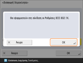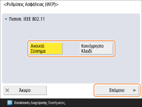 Όταν έχει ρυθμιστεί κοινόχρηστο κλειδί πιστοποίησης στον δρομολογητή ασύρματου LAN, δεν είναι δυνατή η σύνδεση με επιλεγμένο το <Ανοικτό Σύστημα>. Εάν έχετε επιλέξει <Ανοικτό Σύστημα>, η ρύθμιση αλλάζει αυτόματα σε <Κοινόχρηστο Κλειδί> και γίνεται επανασύνδεση.