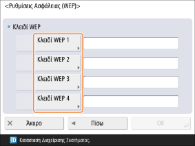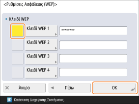 Επιλέξτε ένα μεταξύ των <Κλειδί WEP 1> έως <Κλειδί WEP 4> και εισαγάγετε το κλειδί WEP.