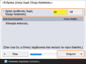 Όταν έχει οριστεί στο <On>, μια διεύθυνση με έλεγχο κατάστασης ανακτάται αυτόματα την επόμενη φορά που θα ενεργοποιηθεί η συσκευή.