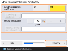 Κατά τη χρήση χειροκίνητης διεύθυνσης, θέστε τη ρύθμιση <Χρήση Χειροκίνητης Διεύθυνσης> στο <On> και εισαγάγετε τιμές για τις ρυθμίσεις <Χειροκίνητη Διεύθυνση>, <Μήκος Προθέματος> και <Προεπιλ. Δ/νση Δρομολογητή>.
