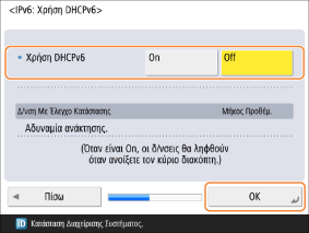 Διαμορφώστε τη ρύθμιση <Χρήση DHCPv6> και πατήστε το <OK>.