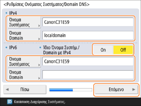 <Ίδιο Όνομα Συστήμ./Domain με IPv4>: θέστε αυτήν τη ρύθμιση στο <On> για να εφαρμοστούν οι ίδιες ρυθμίσεις της IPv4 στην IPv6.