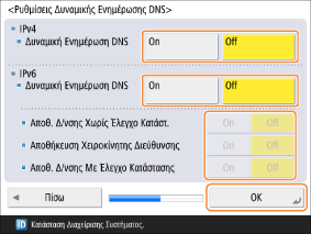<Δυναμική Ενημέρωση DNS>: ρυθμίστε στο <On> για να εκτελείται αυτόματη ενημέρωση όταν αλλάζει η συσχέτιση μεταξύ του ονόματος συστήματος και της διεύθυνσης IP σε περιβάλλον DHCP κ.λπ.