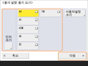 용지 크기를 선택하고 <다음>을 누르십시오.
