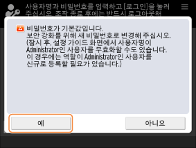 <예>를 눌러 기본 비밀번호를 변경할 수 있습니다.
