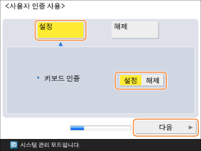 사용자 인증을 사용하려면 <사용자 인증 사용> 및 <키보드 인증>이 <설정>으로 설정되어 있는지 확인하고 <다음>을 누릅니다.
