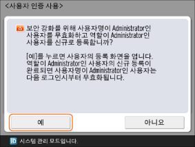 새 관리자 계정을 등록하려면 <예>를 누르십시오.