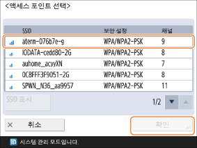 연결할 무선 LAN 라우터의 SSID를 선택하고 <확인>을 누릅니다.