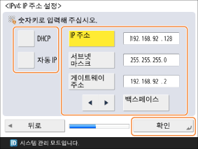IP 주소를 수동으로 입력하려면 <DHCP> 및 <자동 IP>가 선택되지 않았는지 확인하고 <IP 주소>, <서브넷 마스크> 및 <게이트웨이 주소>의 값을 입력합니다.