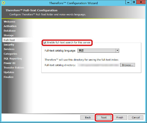 [Enable full-text search for this server]にチェックをつけ、[Full-text catalog language]で[英語]を選択し、[Next]をクリックします