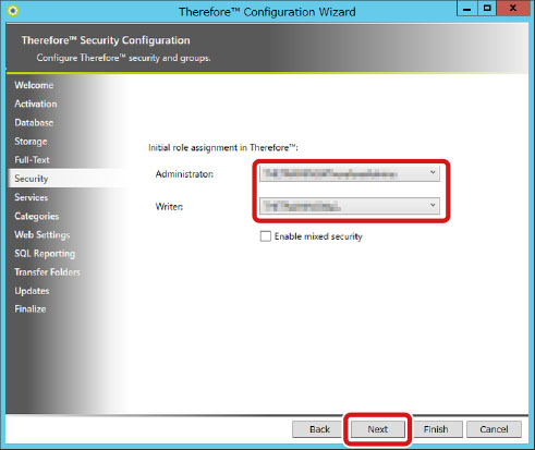 Windows またはドメインのユーザー/グループを利用した認証と、Therefore 上の独自の認証機能を利用した認証があります。この両方を同時運用する場合は、[Enable mixed security] にチェックを入れて混合セキュリティーを有効化してください。
