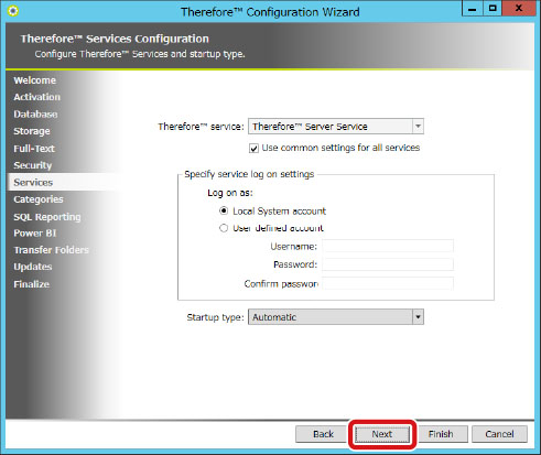 Thereforeサービスの起動方法を設定します。ここでは、すべてのThereforeサービスを自動的にローカルシステムアカウントで起動する設定の画面例を表示しています。