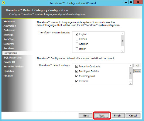 サンプルのカテゴリーについて設定します。ここでは以下の画面例を表示しています。[ThereforeTM system language]=English、[ThereforeTM default categories]=すべてチェック