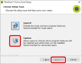 アクセス権の設定に必要なTherefore Solution Designerをインストールするため、ここでは[Custom]を選択します。アクセス権の詳細については、『