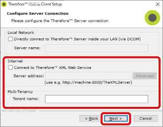 [Connect to ThereforeTM XML Web Service]にチェックを付けて[Server address]にTherefore Server への接続設定を入力し、[Tenant name]にテナント名を入力して、[Next]をクリックします