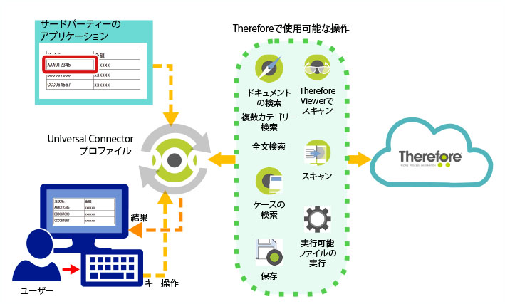 Therefore Universal Connector を利用すると、サードパーティ製のアプリケーションとTherefore をプログラミングなしで連携して操作することができます。これにより、サードパーティ製のアプリケーションに表示された文字列を使用して直接Therefore 内の文書を検索したり、サードパーティ製のアプリケーションからの情報により、 Therefore に取り込んだ文書に対して自動的にインデックスフィールドが入力されるようにすることなどができます。