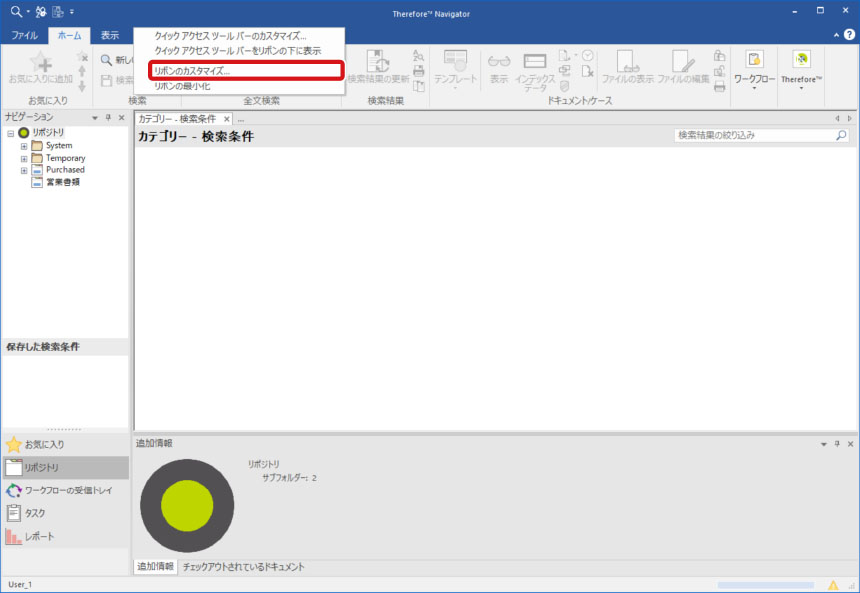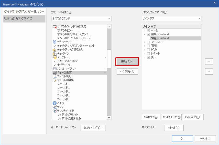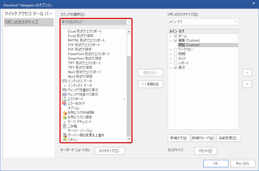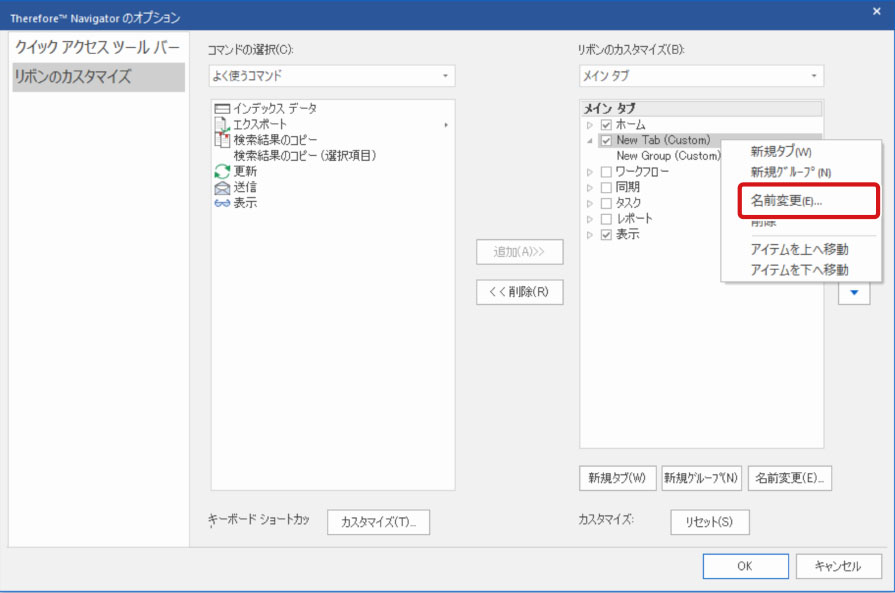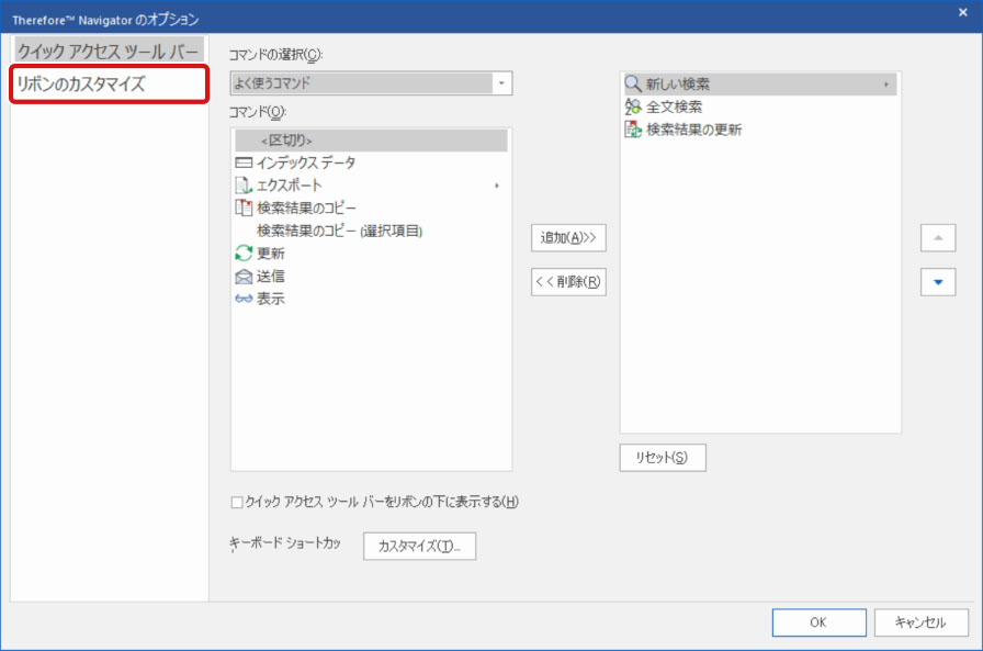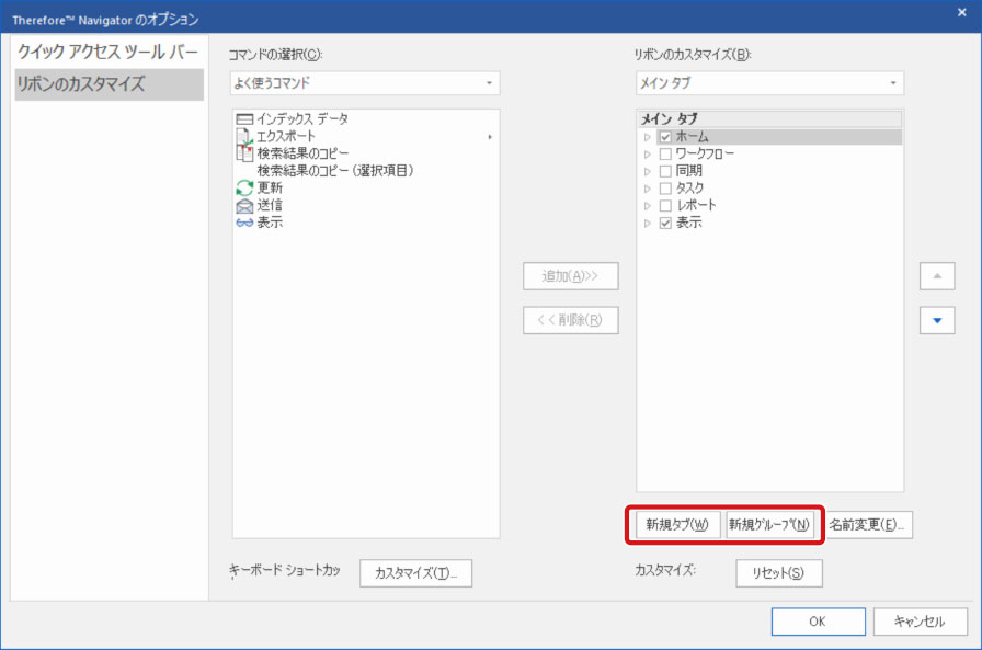 リボンに新しいタブやグループを作成し、初期設定では表示されていないコマンドやよく使用するコマンドを配置してリボンをカスタマイズできます。ここでは、Therefore Navigatorのリボンにコマンドを追加する方法について説明します。