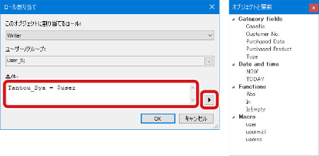 [条件]の[▶]ボタンをクリックして表示される[オブジェクトと関数]ダイアログでは、インデックスフィールドやマクロを入力することもできます。