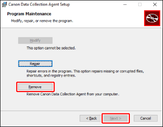 If you do not have the installer used when installing this software, uninstall this software in [Settings] > [Apps & Features] > [Canon Data Collection Agent] in Windows. |