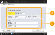 2 | Carry out the necessary settings. According to your environment, enter an IP address of the DNS server. ![]() <IPv4>Press <Primary DNS Server>, and enter an IPv4 address of the DNS server. If there is a secondary DNS server, enter its IP address. If you don't set a secondary DNS server, enter "0.0.0.0". <IPv6>Press <Primary DNS Server>, and enter an IPv6 address of the DNS server. You cannot enter addresses that begin with "ff" (multicast address), addresses that consist of only "0," or local link addresses. If there is a secondary DNS server, enter its IP address. You cannot enter addresses that begin with "ff" (multicast address), addresses that consist of only "0," or local link addresses. This column can be left blank. |