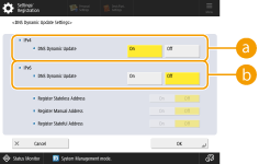 2 | Carry out the necessary settings. ![]() <IPv4>To automatically update the information when correspondence between the host name and the IP address is changed in an environment such as DHCP, press <On> in <DNS Dynamic Update>. <IPv6>To automatically update the information when correspondence between the host name and the IP address is changed in an environment such as DHCP, press <On> in <DNS Dynamic Update>. Turn <On> the address you want to register as a DNS server in <Register Stateless Address>/<Register Manual Address>/<Register Stateful Address>. Please note that automatic update cannot be carried out if all are set to <Off>. |