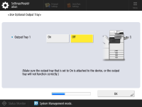 If the <Use Optional Output Tray> screen appears, specify whether you will be using any additional output trays. ![]() If the <Date/Time Settings> screen appears, proceed to Step 6. ![]() Press <On> to enable the output tray or press <Off> to disable it, and press <OK>. The displayed items vary depending on the options installed. | |