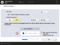 Specify the date and time of the machine. ![]() ![]() Enter the date and time, and press <OK>. Set <Time Zone> and <Daylight Saving Time> as necessary. For more information, see Setting the Date/Time. | |
