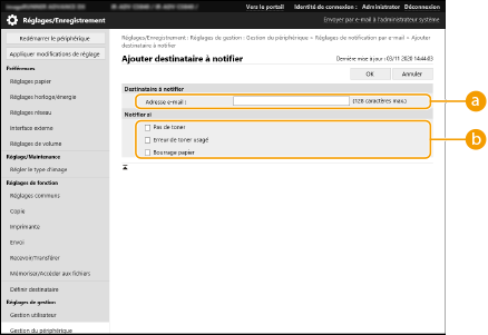 Le résultat de l'envoi de l'email peut être vérifié dans [Suivi statut/Annulation] dans [Journal des tâches]. Ces réglages ne peuvent être définis que par un utilisateur qui dispose des droits administrateur. Ce réglage n'est pas inclus dans la Distribution des informations de périphérique. Diffusion des informations de périphérique vers d'autres imprimantes multifonctions Canon Ce réglage peut uniquement être importé/exporté des appareils de même série. Import/Export des données de réglage Ce réglage est compris dans [Informations de base Réglages/Enregistrement] lors de l'export de lot. Import/Export de tous les réglages |