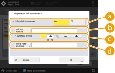 2 | Premere <On> in <Utilizzo indirizzo manuale> ed eseguire le impostazioni necessarie. ![]() <Utilizzo indirizzo manuale>Premere <On>. <Indirizzo manuale>Premere il pulsante <Indirizzo manuale> e inserire un indirizzo. Non si possono utilizzare i seguenti indirizzi. Indirizzi che iniziano con "ff" (indirizzi multicast) Indirizzi composti solo da "0" Indirizzi compatibili IPv4 (indirizzi IPv6 dove i 96 bit superiori sono "0" con un indirizzo IPv4 contenuto nei 32 inferiori) Indirizzi mappati IPv4 (indirizzi IPv6 dove i 96 bit superiori sono "0:0:0:0:ffff:" con un indirizzo IPv4 contenuto nei 32 bit inferiori) <Lunghezza prefisso>La lunghezza della sezione dell'indirizzo di rete può essere modificata. <Indiriz. router predefinito>Premere <Indiriz. router predefinito> e inserire un indirizzo. Non si possono utilizzare i seguenti indirizzi. Indirizzi che iniziano con "ff" (indirizzi multicast). Indirizzi composti solo da "0" Se non si specifica un indirizzo, lasciare la colonna vuota. |
