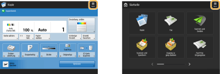 Drücken Sie , das auf der <Startseite> und auf dem Grundfunktionsbildschirm angezeigt wird, um den Bildschirm anzupassen und beispielsweise Schaltflächen neu anzuordnen oder eine Schnelltaste anzulegen. Anpassen des Sensordisplays![]() Sie können die Einstellungen im Bezug auf die Bildschirmanzeige ändern, wie beispielsweise der Bildschirm, der unmittelbar nach Einschalten des Geräts angezeigt wird, und ob die Meldung für verbleibende Papier- und Tonermenge erscheint. <Einstellungen Anzeige> Sie können festlegen, welcher Bildschirm nach Verstreichen einer bestimmten Zeit der Inaktivität angezeigt wird. <Funktion nach automatischer Rückstellung> |