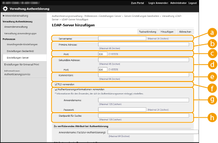 3 | Geben Sie die LDAP-Server Informationen ein. ![]() [Servername]Geben Sie den Namen für den LDAP-Server ein. Der Name "localhost" kann nicht verwendet werden. Der Servername darf keine Leerstellen enthalten. [Primäre Adresse]Geben Sie die IP-Adresse oder den Hostnamen des LDAP-Servers ein (Beispiel: ldap.example.com). Die Loopback-Adresse (127.0.0.1) kann nicht verwendet werden. [Port:]Geben Sie die für die Kommunikation mit dem LDAP-Server verwendete Portnummer ein. Verwenden Sie dieselbe Einstellung, die auf dem Server konfiguriert ist. Wenn Sie keine Nummer eingeben, wird sie automatisch auf "636" festgelegt, wenn das Kontrollkästchen für [TLS verwenden] aktiviert ist, oder auf "389", wenn das Kontrollkästchen deaktiviert ist. [Sekundäre Adresse:] / [Port:]Geben Sie die IP-Adresse und die Portnummer ein, wenn Sie einen sekundären Server in Ihrer Umgebung verwenden. [Kommentare]Geben Sie bei Bedarf eine Beschreibung oder einen Hinweis ein. [TLS verwenden]Aktivieren Sie das Kontrollkästchen, wenn die TLS-Verschlüsselung für die Kommunikation mit dem LDAP-Server verwendet wird. [Authentisierungsinformationen verwenden]Deaktivieren Sie das Kontrollkästchen, um anonyme Zugriffe auf den LDAP-Server zuzulassen, jedoch nur, wenn der LDAP-Server für anonyme Zugriffe eingerichtet ist. Wenn der Benutzername und das Passwort für die Authentifizierung verwendet werden, aktivieren Sie das Kontrollkästchen, und geben Sie die Werte für [Anwendername:] und [Passwort:] ein. [Startpunkt für Suche:]Geben Sie die Position (Ebene) an, um nach Benutzerinformationen zu suchen, sobald die LDAP-Serverauthentifizierung durchgeführt wird. |