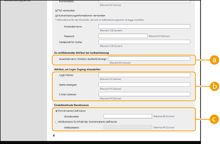 4 | Geben Sie an, wie Attributnamen und Domainname festzulegen sind. ![]() [Anwendername (Tastatur-Authentisierung):]Legen Sie das LDAP-Datenfeld (Attributname) für den Benutzernamen auf dem LDAP-Server fest (Beispiel: uid). [Login-Name:] / [Name anzeigen] / [E-Mail-Adresse]Legen Sie die LDAP-Datenfelder (Attributnamen) für den Anmeldenamen, Anzeigenamen und die E-Mail-Adresse des jeweiligen Benutzerkontos auf dem LDAP-Server fest (Beispiel: uid, cn, mail). [Domännamen definieren] / [Attributname für Erhalt des Domännamens definieren]Wählen Sie, wie der Domänenname des Anmeldeziels festgelegt werden soll. Um den Domänennamen direkt festzulegen, wählen Sie [Domännamen definieren], und geben Sie den Domänennamen* ein. Um ein LDAP-Datenfeld (Attributname) festzulegen, aus dem der Domänenname auf dem LDAP-Server bezogen wird, wählen Sie [Attributname für Erhalt des Domännamens definieren], und geben Sie dann den Attributnamen ein (Beispiel: dc). |
