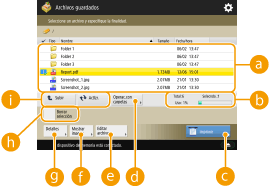 Archivos y carpetas guardadosMuestra si hay archivos o carpetas seleccionados, iconos que indican el tipo de archivo o carpeta, nombres, tamaños y fechas/horas de almacenamiento.