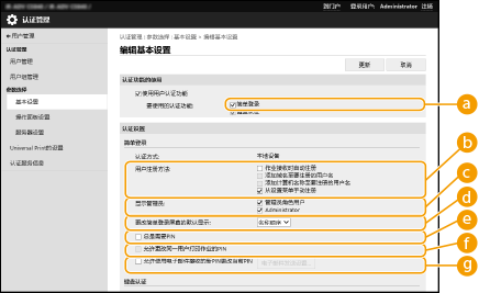 选择[使用用户认证功能]复选框,然后指定所需的设置。