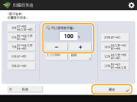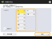 注册扫描尺寸如果经常指定具有相同值的扫描尺寸,为方便起见,可以在<自定义> <注册尺寸>中注册该尺寸以便快速恢复设置。若指定扫描尺寸采用指定的扫描尺寸(<自定义>、<长条形原稿>或<任意尺寸>)扫描的文件无法存储在邮箱中。 如果目前正在使用<扫描后存储>功能,则无法选择<长条形原稿>。 |