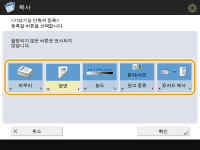 기본 특징 화면에 있는 설정 항목의 수와 표시될 위치는 기능에 따라 달라집니다. <할당없음>을 단축키로 설정하면 단축키 버튼이 표시되지 않습니다. 등록할 수 있는 <기타 기능>에 대한 단축키의 수는 다음과 같이 제한됩니다. 복사(기본): 5 복사(고속): 6 팩스: 4 스캔 및 전송: 2 복사 기본 특징 화면을 고속 복사 화면(설정을 빠르게 변경(고속 복사 화면))으로 변경했으면 3단계의 버튼을 선택하고 <등록>을 누릅니다. |