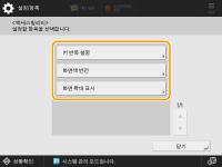기기가 시작될 때 표시되는 화면을 설정합니다.기기가 시작될 때 사용자가 로그인을 하도록 구성된다면( 로그인 화면 표시 시점 지정하기), <기동/복구후 표시화면>은 <개인 설정>의 항목으로 표시됩니다. 기기가 시작된 후 표시되는 화면은 각 사용자를 위해 설정될 수 있습니다. |