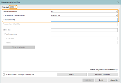 Klikněte na kartu [Zadat cíl] a zadejte používaný režim komunikace a faxové číslo.