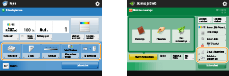 Voit vaihtaa asetuspainikkeet, jotka näkyvät perustoimintojen näytössä (kopio, faksi ja skannaus). Voit myös näyttää kullekin kirjautuneelle käyttäjälle mukautetut perustoimintojen näytöt.