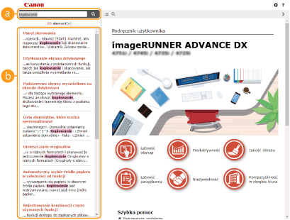, aby wyświetlić ekran wyszukiwania. Karta ta zawiera pole tekstowe umożliwiające wykonanie wyszukiwania według słów kluczowych i odnalezienie szukanej strony.