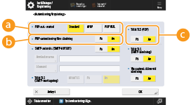 Ange autentiseringsinformation vid sändning: När <Användarnamn> och <Lösenord> som har angetts i <SMTP-autentis. (SMTP-AUTENT)> används och autentiseringsskärmen (<Logga in till SMTP-server>) visas vid sändning