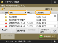 一覧表示にジョブやファイルが複数ある場合、<名称>または<日付/時刻>を押すことで、表示順をソートすることができます。が表示された場合は昇順、が表示された場合は降順に押すごとに切り替わります。