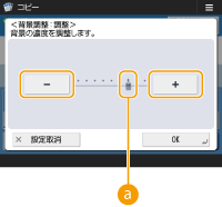 背景濃度の調整のように数値を増減させて設定するものは、<->/<+>などの左右に配置されたボタンを押して調整します。ボタンを押すたびにスライダー()が移動し、数値が増減します。ボタンを押し続けると、値をすばやく変化させることができます。