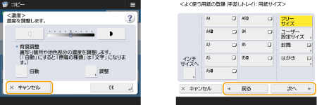 ほかにも、設定を中止して前の画面に戻る<キャンセル>、設定を確定して次の画面に進む<次へ>、前の設定画面に戻る<戻る>、現在開いている画面を閉じる<閉じる>といったボタンが表示されます。