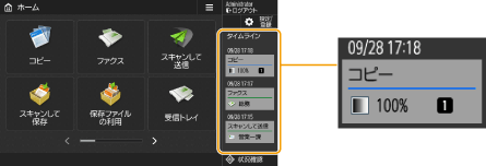 タイムラインに表示されているアイコンや各項目については、タイムラインの表示項目を参照してください。 ログインしているユーザーごとにタイムラインを表示できます。また、ログインしていない場合は、未認証、ゲストユーザーなど認証を使用していないユーザーで共通のタイムラインを表示することもできます。<未認証ユーザーのタイムライン表示>と<認証ユーザーごとのタイムライン表示>を使いかたに合わせて変更してください。<ホーム>画面をカスタマイズする 未認証、ゲストユーザーなど認証を使用していないタイムラインは、<主電源ON時の高速起動>が<ON>に設定されていて、高速起動が実行された場合に保持されます。<主電源ON時の高速起動>がOFFの状態で電源をOFFにした場合、または高速起動できなかった場合は、未認証、ゲストユーザーなど認証を使用していないタイムラインは削除されます。 タイムラインはインポート/エクスポートには対応していません。設定データをインポート/エクスポートする |
