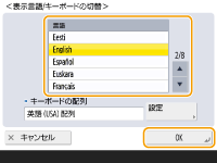 が表示されます。表示言語切り替えボタンを押し、一覧から言語を選んで<OK>を押すと、表示言語を切り替えることができます。