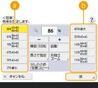 <XY独立自動>を設定した場合は、<用紙選択>で用紙を設定します。用紙を設定しないと、最上段の用紙カセットにセットされている用紙のサイズにあわせて自動的に倍率が設定されます。