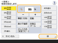 原稿と同じサイズの用紙に等倍でコピーすると、原稿の端に配置されている画像がわずかに欠けてしまう場合があります。<倍率>  <少し小さめ(全面コピー)>を押すと、少しだけ縮小してコピーされるので画像の欠けを防ぐことができます。 <少し小さめ(全面コピー)>を設定すると、自動的に<移動>が<センター>に設定されます。 OHPフィルムのように透明度の高い原稿は自動的に倍率を設定できません。定形変倍またはズーム変倍で読み込みしてください。 <自動>で倍率を指定する場合は、マニュアル用紙選択で用紙を選択します。用紙を選択しないと、自動的に最上段の用紙カセットを選択し、その用紙のサイズにあわせて自動的に倍率が設定されます。 |