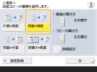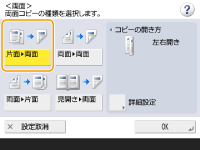設定を変更するときは<詳細設定>を押します。原稿のオモテ面とウラ面の上下(天地)が同じ向きの場合は<左右開き>を選び、オモテ面とウラ面の上下が反対向きの場合は<上下開き>を選びます。また、コピー結果をどのような開き方にするかを<左右開き>、<上下開き>で設定します。