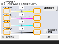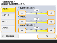 ![]() | イエロー(黄)、マゼンタ(赤系)、シアン(青系)、ブラック(黒)の濃度を個別に調整します。 |